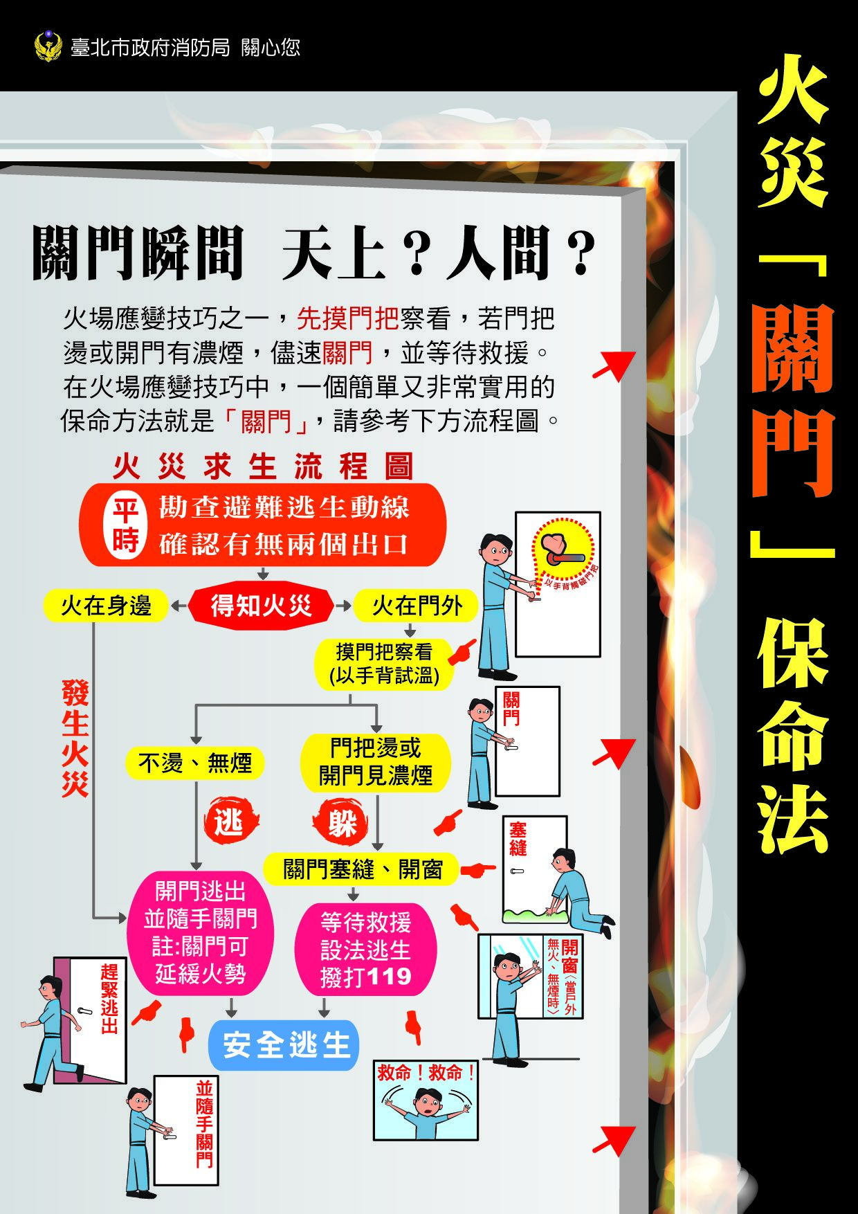 聯絡電話:27297668轉8100 火災千萬別躲浴室 關房門、塞縫、開窗、打119保平安
