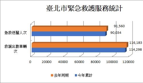 | 救護出勤車輛次 | 急救送醫人次 | 非創傷類人次 | 創傷類人次 | |